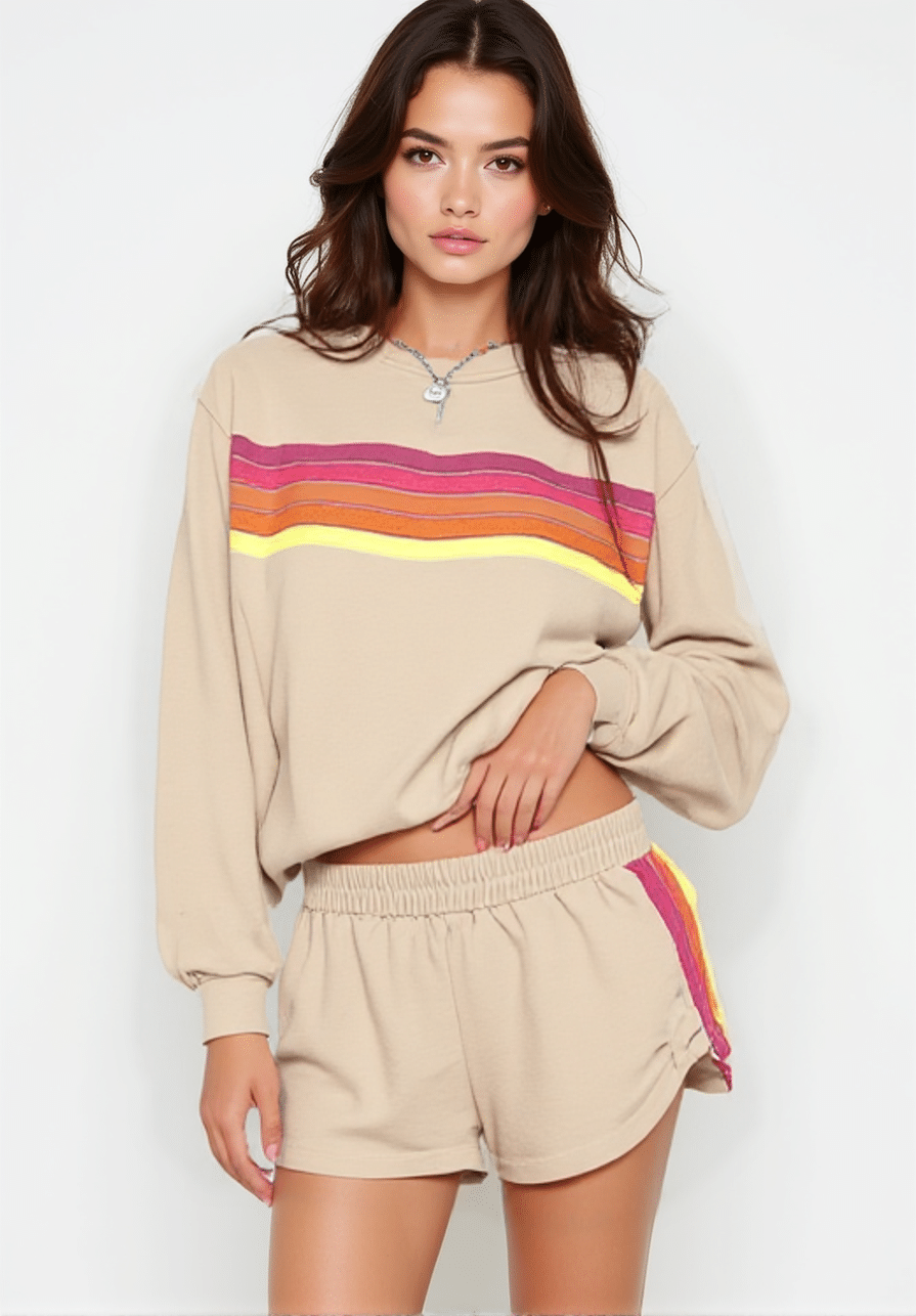 The J-Bow retro set is a vibrant Juicy Lucy essential that brings colour to every moment. With rainbow-inspired shorts and a lightweight jumper, it’s the perfect pair for coffee catch-ups, park strolls, or shopping days. Bright, cozy, and effortlessly chic, it’s made to carry you through brisk summer afternoons, sunny winter mornings, and everything in between
